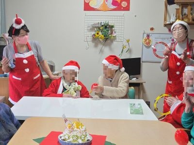 今日は楽しいクリスマスです。入居者様方はカスタネット、タンバリン、マラカスでリズムをとりながら、職員と一緒にクリスマスソング、『ジングルベル』、『サンタがまちにやってくる』『あわてんぼうのサンタクロース』『もろびとこぞりて』等を楽しく愉快に歌いました。次にお楽しみの紙芝居、『どうぶつ山のクリスマス』を職員が感情をこめて読み上げました。最後に職員特製のクリスマスケーキを頬張りながら楽しく美味しい時間を過ごして頂きました。