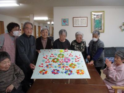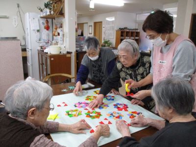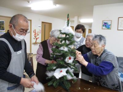 リースやサンタさんを折紙で作りました。鈴はちょっと難しかったそうです。「サンタさんの顔可愛く描こうか?」「格好よく描こうよ」「描けないなぁ~私に似ているよ」と楽しそうです。壁画として貼り付けたら雪と一緒にサンタさんが幸せを運んで降っているようです。皆様大満足でミニツリーに飾りつけをしてくれました。
