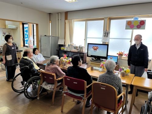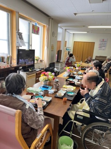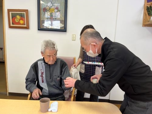 今日で2025年も終わりを告げます。法人理事が年末のご挨拶にいらして入居者様方お一人ひとりに声を掛けながら甘酒を注いでくださいました。皆様、緊張しながらも理事の言葉にはにかむ様子が印象的でした。給食委託をしている関連企業で用意して下さった『大晦日の行事食』を召し上がった後、入居者様方のリクエストに応えて歌会で楽しんでいただきました。