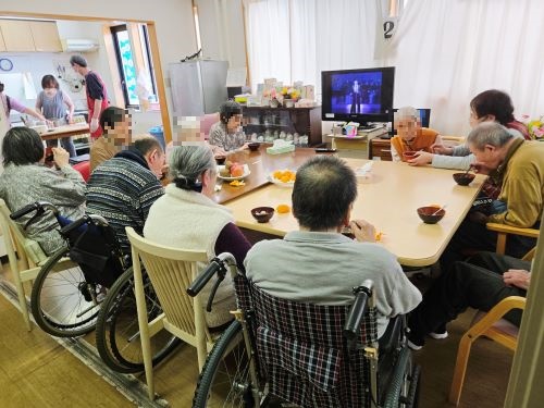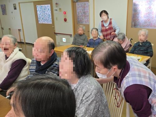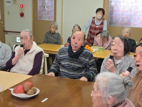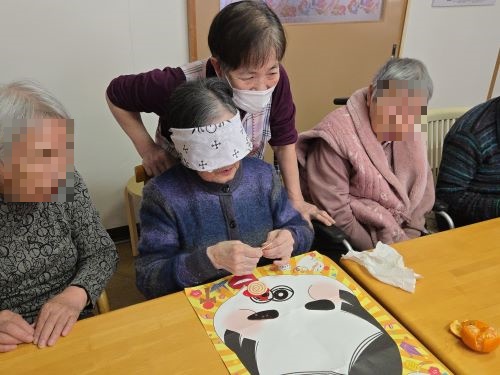 こぎく、こでまり合同でお正月を祝いました。全員で、お正月の歌を声高らかに元気に歌い、『笑う門には福来る』ということで福笑いで大笑いして頂きました。皆様、一生懸命考えて目、口、鼻・・・と挑戦し出来上がりを見て大笑いでした。最後に、白玉団子のお汁粉を仲良く召し上がって頂きました。今年もステキな一年になります様に!