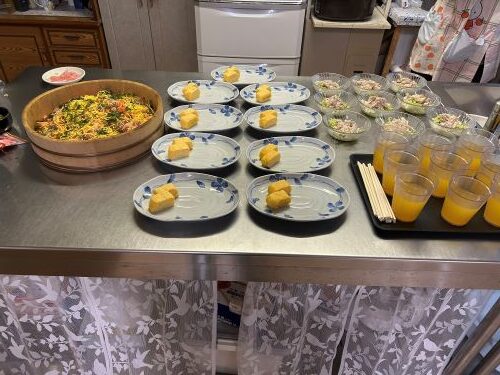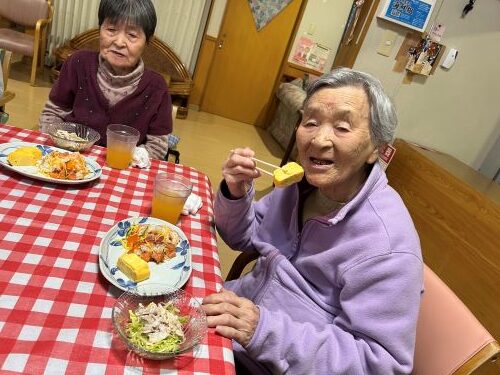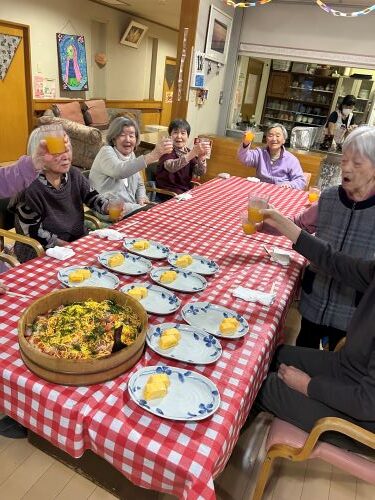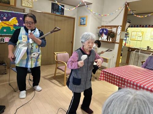新たな年を迎え、「星遊荘新年会」を開催致しました。職員が「望郷じょんがら」の歌に、スコップ三味線を奏でると、入居者様が手踊りを披露してくださいました。また、夕食は全員で乾杯、海鮮チラシ寿司・冷しゃぶサラダ・出汁巻き卵焼き・すまし汁を堪能しました。