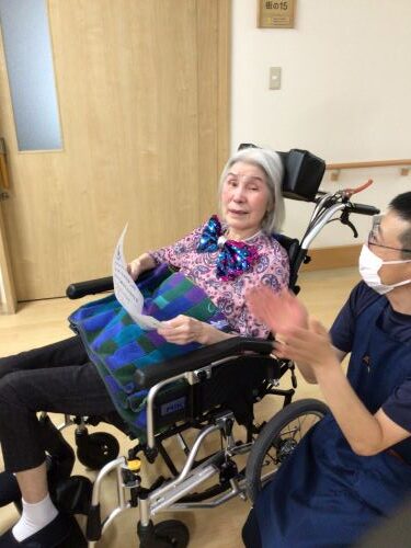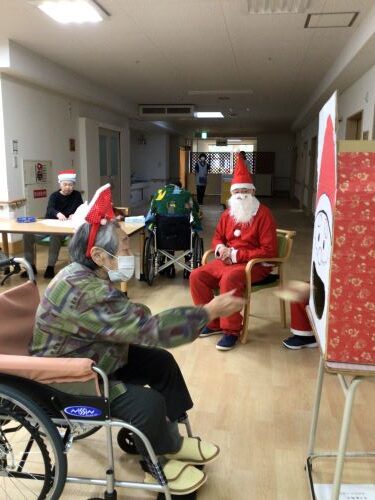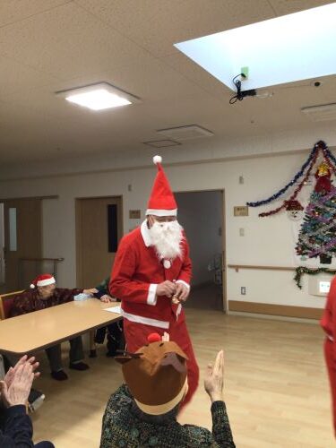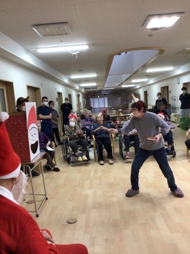 いちい荘ひばり組に、今年もサンタクロースが来ました。しかし、ひばり組に現れたサンタさんは、タダではプレゼントは置いていきません。「プレゼント配りで疲れたサンタの口にお菓子を入れよう」ゲームで体を動かし、皆さんへ健康というプレゼントを置いていきました。大盛り上がりのクリスマス会でした。