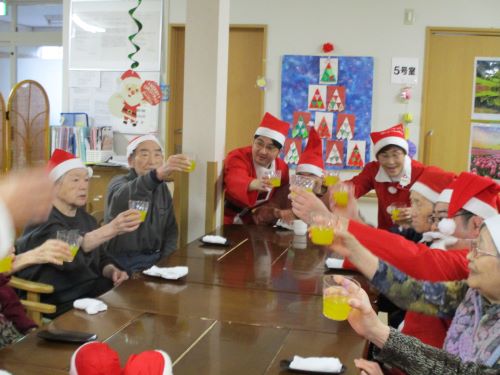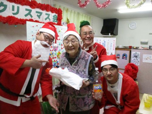 職員の演奏に手拍子や歌を入れて下さり、ハンドベル隊は【きよしこの夜】を奏でて下さり、盛り上がって楽しいクリスマスコンサートでした。今年も、面白サンタさん達がプレゼントを配っている時は皆様ドキドキの笑顔で嬉しそうです。欲しかった物が入っているので歓声が聞こえ、乾杯の後の美味しいケーキが登場すると、どよめきが起こりました。「これは何味?チョコがいい」「私はクリーム食べる」と賑やかです。今年も皆様と楽しいクリスマスを一緒に過ごす事が出来て幸せです。