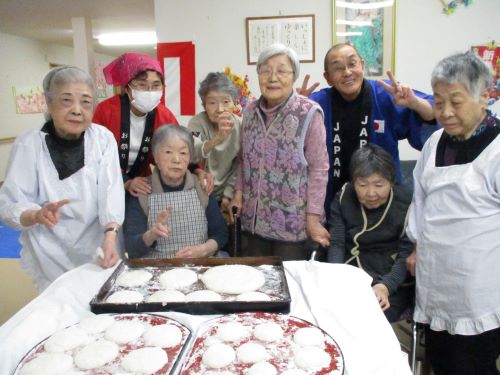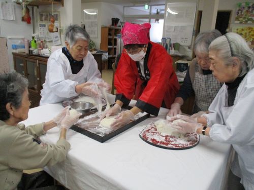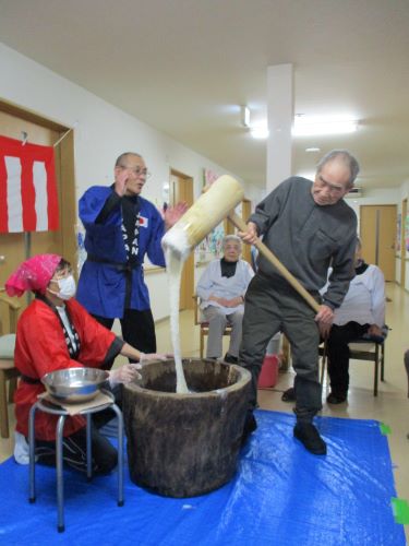 毎年恒例の餅つき大会です。「あんたやってけ」と言っていたギャラリーの方も、結局は見ていられず今年も出てきては全員が餅つきをしています。出来たお餅を手際よく丸めてお供え餅を作りました。少し乾いて硬くなったらみかんをのせて飾るそうでが、今日はつきたてのお餅を食べました。粒餡ときな粉にまぶして「やっぱりつきたての餅は美味いね」と美味しくいただきました。皆様、お疲れ様でした。