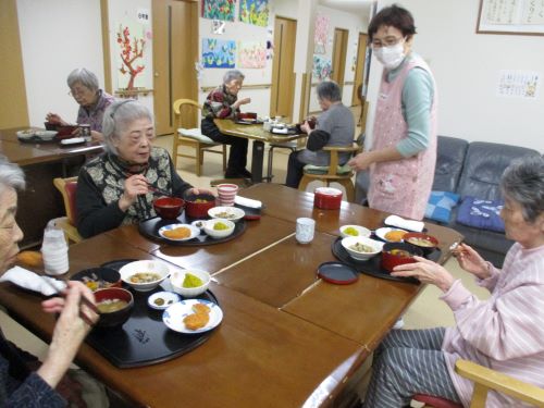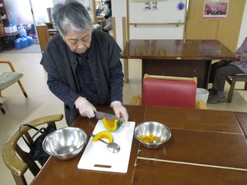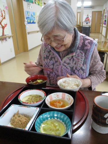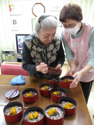 お昼は『①かに飯②鮟鱇のとも和え③きのこあんかけ茶碗蒸し④みかん入り大根なます⑤焼きりんご⑥豆腐と菊花すまし汁』の行事食。かに飯は上品な味で大人気でした。鮟鱇も久しぶりに食べたそうで、残すことなく皆様きれいに食べて下さいました。夕食は、毎年恒例の小豆粥です。赤い色の食べ物は魔除けの意味を持つとされ、はくちょう荘でも毎年15日に無病息災や邪気払いの願いを込めて食べています。副食は①チキンカツ②けの汁風煮③かぼちゃサラダ④板麩とねぎの味噌汁⑤赤かっぱ漬けです。粥にかぼちゃをトッピングして今年も美味しく出来上がりました。