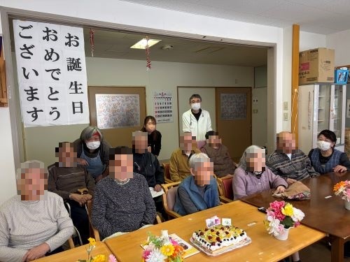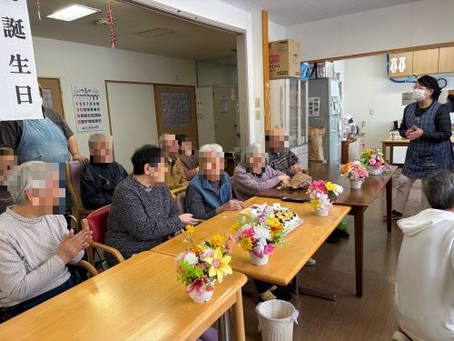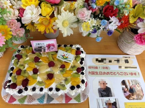今月はA様が90歳になられました。職員からは、写真とメッセージ入りの色紙と、手作りケーキをプレゼントしました。ケーキには女性の入居者様方のご希望を叶えて、老化や病気を防ぎ免疫力を高め美肌効果もあるビタミンCがたっぷり入ったキウイやフルーツをふんだんに使いました。全員でハッピーバースディソングを歌い、手遊びも入れて愉快にお祝いしました。最後にケーキとあたたかいココアでお茶会を楽しんでいただきました。お誕生日おめでとうございます。