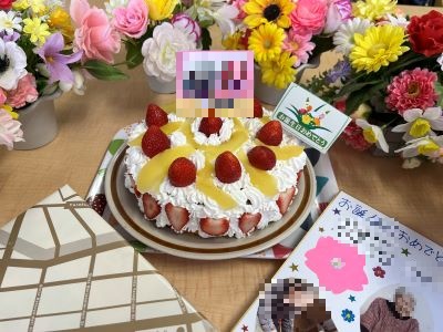 A様が85歳のお誕生日を迎えました。前日、長男様がお祝いに駆け付けて下さり、本人様が大好きなクッキーと羊羹、カフェオレを届けて下さいました。今日は、朝からリビングに看板を掛け、『HAPPY BIRTHDAY TO YOU』の歌を流し誕生会の準備をしまた。A様が隣席のB様に「今日ね、私の誕生日なんだよ。ほら見て!私の名前書いてるでしょう。」と嬉しそうに看板を見て説明しておられました。職員からの写真とメッセージ入りの色紙と職員手作りのリンゴのコンポート、イチゴたっぷりのケーキのプレゼントに「ありがとうね。いくつになっても嬉しいわ。」と喜んでいただけました。