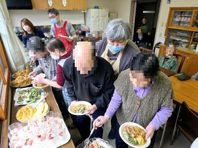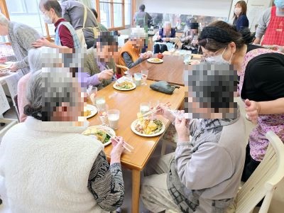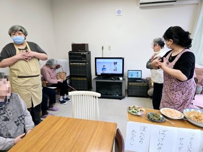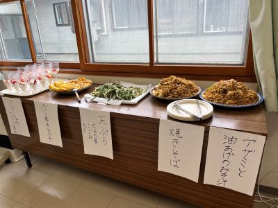 今日の昼食は、こぎくユニット、こでまりユニットで仲良く交流しながらバイキングで美味しく召し上がって頂きました。先ずは、皆さんで誤嚥や誤嚥性肺炎予防のために嚥下体操を行いました。バイキングメニューは、【天ぷら(たらの芽・こごみ・うど)・だし巻き玉子・きのことウインナーの炒めもの・ツナと人参のサラダ・焼きそば・おむすび3種(ゆかり・しゃけわかめ・ばっけみそ入り)・ばっけみそ・ボンナのおひたし・アザミと油揚げの味噌汁・煮りんご・フルーチェのフルーツ添え・フレッシュバナナジュース】です。山菜をふんだんに使い春の味覚を楽しんで頂きました。