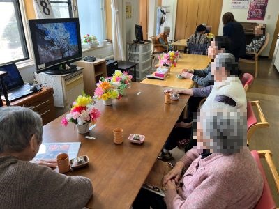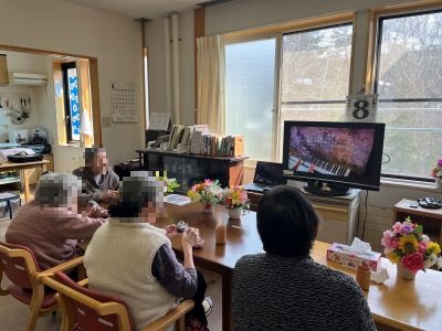 長かった大雪の日々もようやく終わりを告げ、もうすぐ雪国青森にも桜の季節がやってきます。今日は、A様の弟様ご夫妻が、お兄様が仲良くしていただいている入居者様方にと近所のお餅屋さんに作って頂いた道明寺を差し入れしてくださいました。動画で満開の桜を見ながら楽しくおいしい時間を過ごしていただきました。