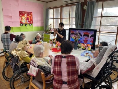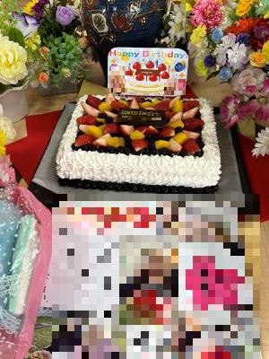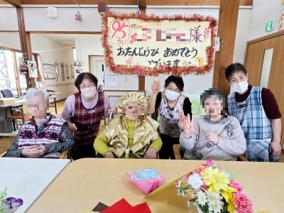 A様が95歳になられました。お誕生日当日、1日には、長男様ご夫妻、次男様ご夫妻とお孫さんがお祝いに駆け付けて下り、長男様と次男様の妻お二人からは若草色のニットのセーターとグレーのニットのワンピース、スカーフ、長男様と次男様からはA様が大好きなドリンク、イチゴのバースデイケーキ、お孫さんからは花束とカードをプレゼントされ満面の笑みでした。職員からは写真とメッセージ入りの色紙とハンドタオル、手作りのフルーツたっぷりのケーキがプレゼントされ、笑顔が溢れた楽しい一日になりました。