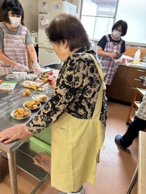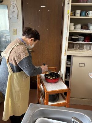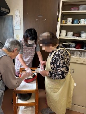 毎月1回、自分達で調理をして食べる講評企画「クッキング」。今月は、電気調理器で「たこ焼き」を作りました。慣れた手つきで、クルクルと回転させる様子は、さながら本場・大阪仕込みかと思う位でした。柔らかいたこ焼きと食欲をそそるソースの香りに包まれて、皆様で美味しく頂きました。