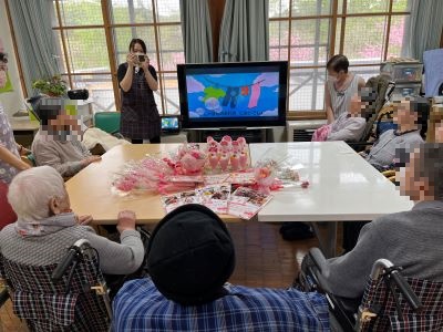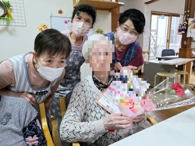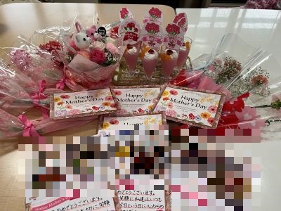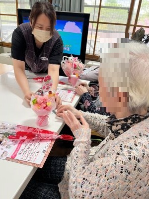 『母の日』の今日、家族様方が面会にいらしたり、プレゼントが届けられたり、対話を楽しまれたりと家族様とのゆったり嬉しい時間を過ごされていました。こでまりユニットでは、職員からの『母の日のお祝いの言葉』の後、家族様が入居者様方お一人ひとりにとプレゼントして下さったカーネーションと職員一同が心を込めて作成した手作りカーネーション、メッセージ入りカードをプレゼントして記念撮影しました。全員で『おかあさん』を歌い、職員手作りのスイーツでおやつタイムを楽しんでいただきました。