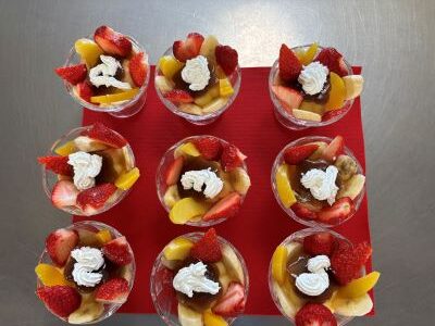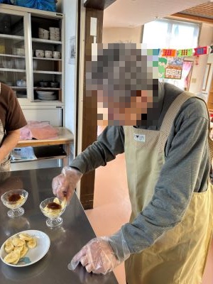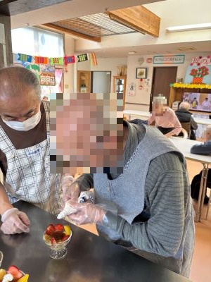 日頃の感謝の気持ちを込めて、男性入居者様と職員でプリンアラモードを作りました。宮田館のお母さま方は、とても喜ばれてアッと言う間に完食されていました。