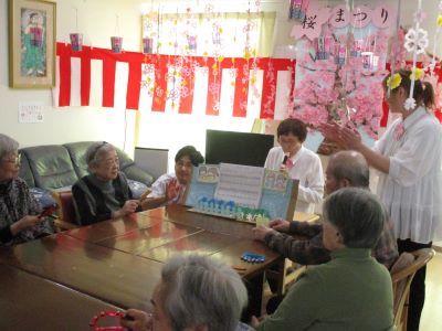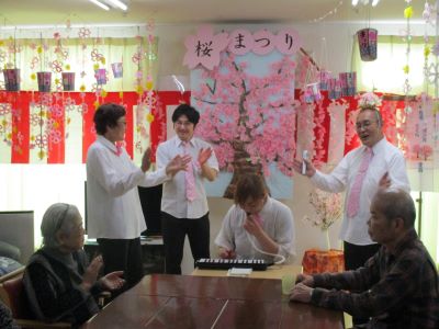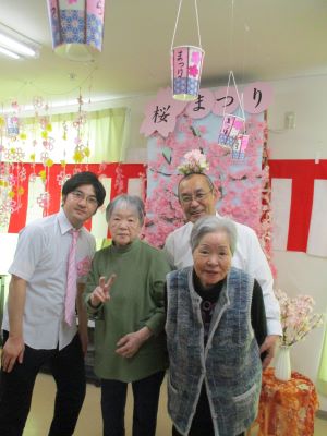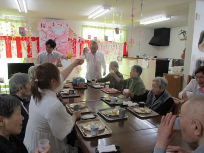 今日は青森市の桜マラソンの日です。はくちょう荘の桜も満開で、お花見を楽しみました。皆様でコツコツ作ったぼんぼりや提灯が揺れてお花見の雰囲気はバッチリです。職員の演奏に皆様で歌い、笑い、一緒に演奏してまた大笑い。乾杯のビールはノンアルなのにいつもより皆様陽気になっています。昔話にも花が咲き、職員とラブラブで花見をしたり今日も楽しい時間を共有できました。もう来年のお花見を楽しみにしている皆 様でした。