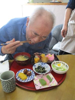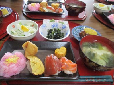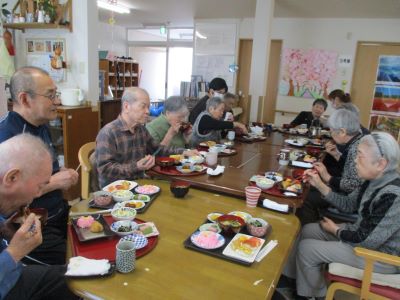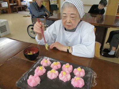 メニューは①桜と握りセット②潰し豆腐のみそ汁③チキンナゲットと鶏つくね串④ちりめん雑魚と若布の炒め物⑤パワフルサラダ⑥春のういろうです。入居者様と一緒に献立を考え、希望の握りずしで、まぐろとサーモンは早々と食べていました。パワフルサラダには秘密の元気の源が入っているのでワクワクしながら食べています。桜ご飯は偶然に思いついたペットボトルの底で象っています。一緒に作りながら、子供に作っていたころの話や家族で食べた話など思い出がたくさん蘇ってきていました。今回も美味しく残さず食べています。